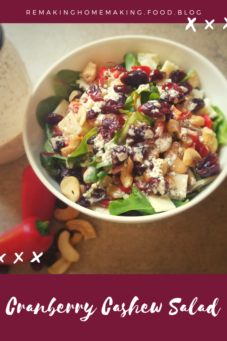 It has yummy dried cranberries, cashews, sweet peppers, and my favorite, havarti cheese! All topped with a homemade ranch dressing that is easy and delicious!